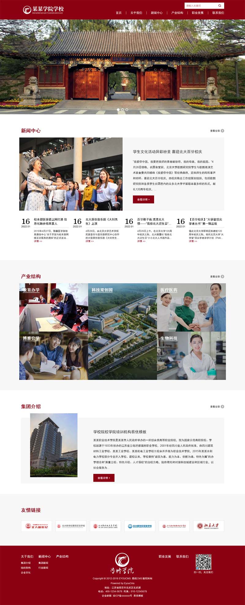 本模板自带eyoucms内核,无需再下载eyou系统,手工书写DIV+CSS,完美兼容IE7+、Firefox、Chrome、360浏览器等;主流浏览器;结构容易优化;多终端均可正常预览,该易优cms模板不单单适用于学校,院校,学院,培训机构,大学,技校,职高,技能培训,中小学类企业网站。您只需要把图片和文章内容换成您的即可,颜色都可以修改,改完让您耳目一新的感觉!