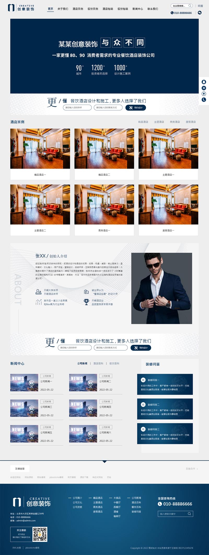 k_pbcms556(自适应)响应式创意餐饮酒店装饰设计类网站pbootcms模板 html5蓝色餐饮酒店设计网站源码下载